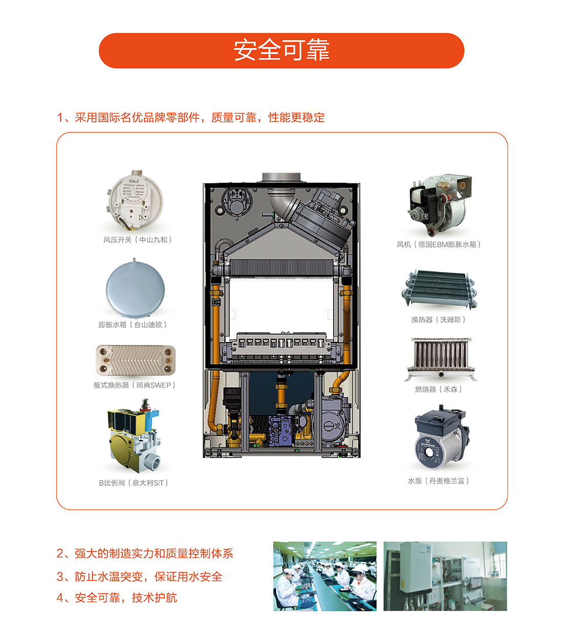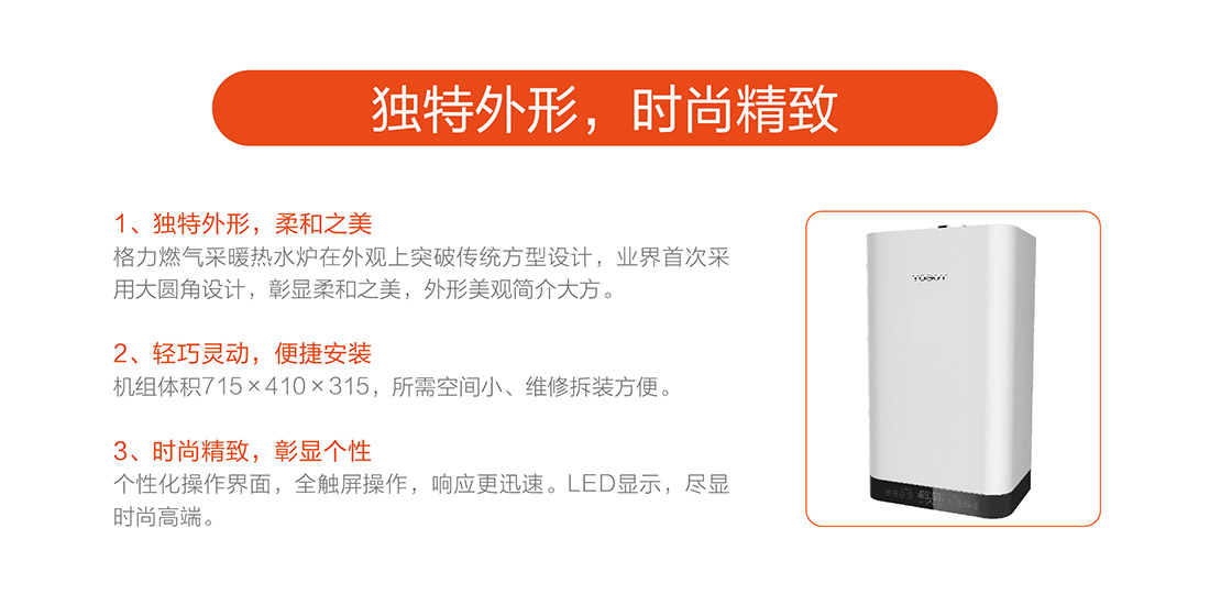 充分燃燒效率達到90%以上,采用智能水溫調節,快速出熱水,減少水流浪費,恒溫±0.5℃以內精確控制,生活水溫度35-60℃,采暖水溫30-80℃。
